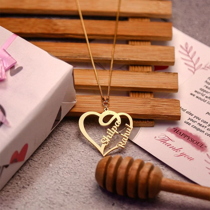 The personalized Double Name Pendant is made of Sterling Silver and will arrive in a black velvet jewelry pouch. The pendant has two hearts that are connected by a chain, and it has the names of your choice on the front of each heart.